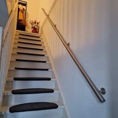 RVS trapleuning - rond - met trapleuning houders type 5 + bevestigingsmaterialen - op maat - van 30 t/m 595 cm - geborsteld RVS 304. Een ronde RVS trapleuning van geborsteld RVS 304 met een diameter van 42,4 mm. Een klassieke ronde RVS leuning, met de moderne look van roestvrij staal: Een toegankelijke trapleuning van RVS, geschikt voor een breed scala aan interieurstijlen. Deze leuning(drager) is geschikt voor verticale & horizontale plaatsing. Denk hierbij bijv. aan een railing op een muurtje, zoals een stenen (trap)balustrade, of als extra verticale 'handgreep' bij uw trap.