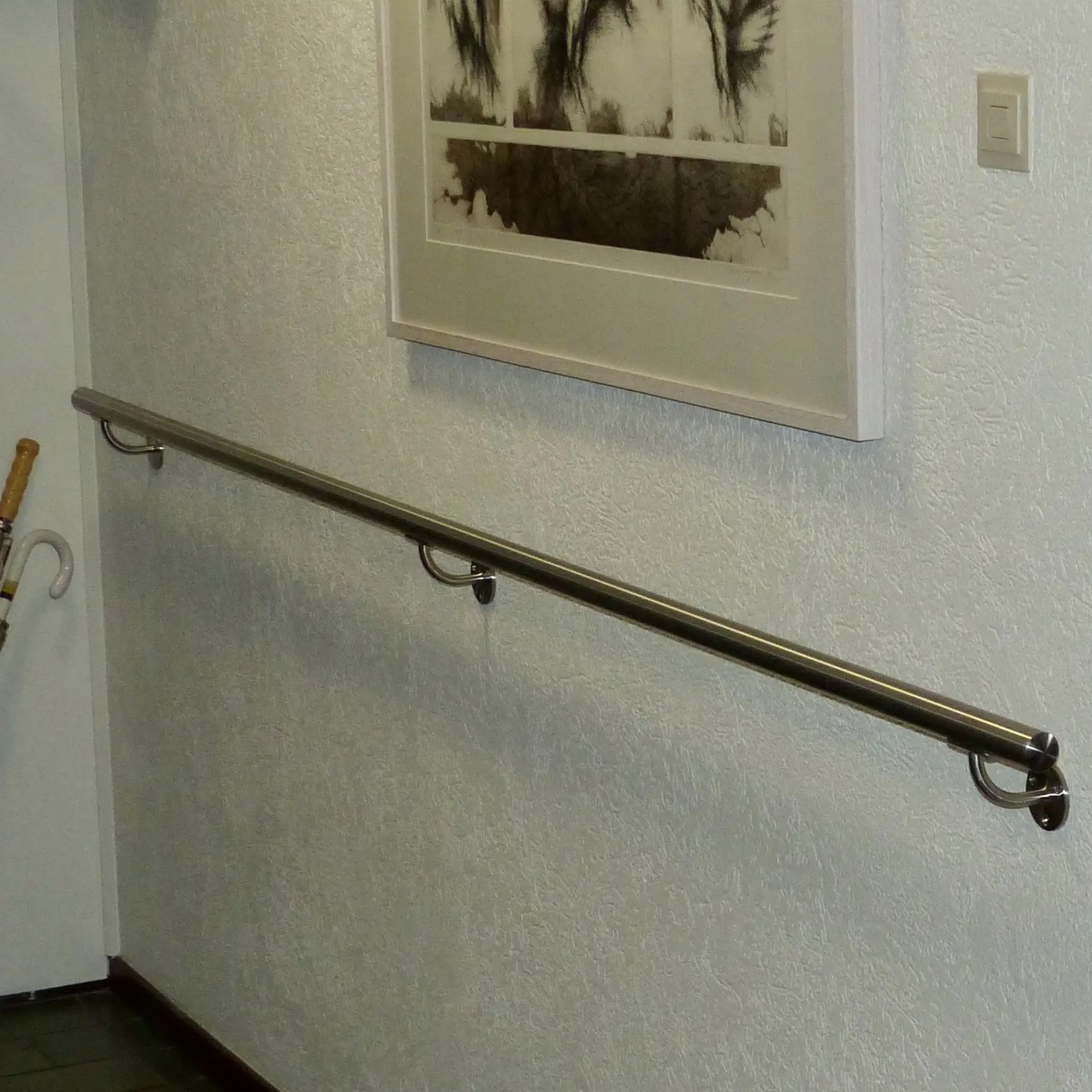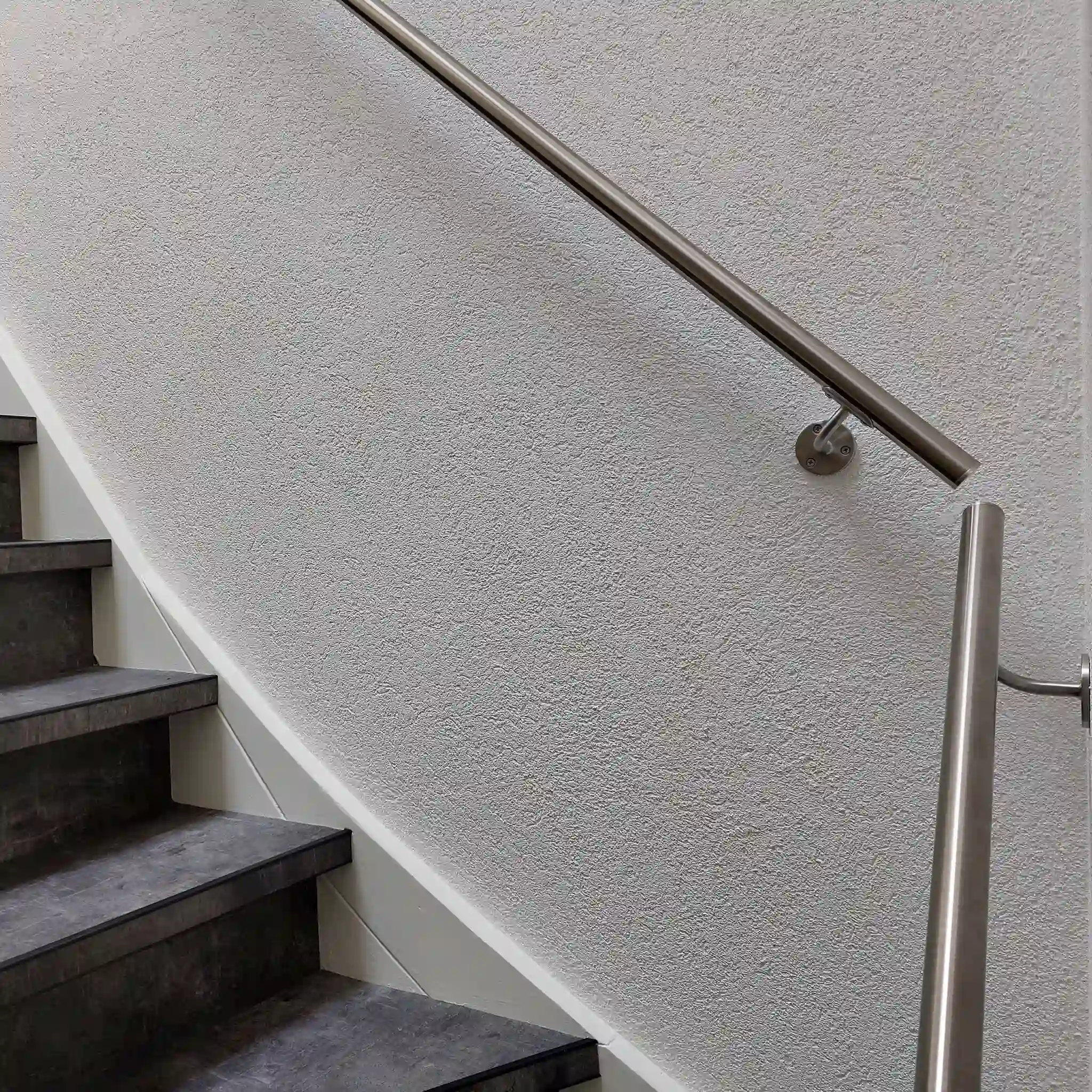 RVS trapleuning - rond smal - met trapleuning houders type 2 + bevestigingsmaterialen - op maat - van 30 t/m 595 cm - geborsteld RVS 304. Een smalle ronde RVS trapleuning van geborsteld RVS 304 met een diameter van 33,7 mm. Een klassieke ronde leuning, met de moderne look van roestvrij staal: Een elegante trapleuning van RVS, geschikt voor een breed scala aan interieurstijlen.