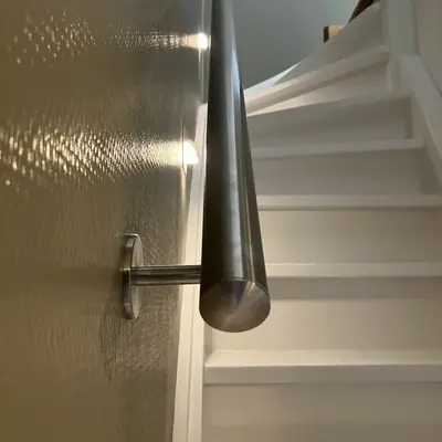 Een elegante RVS trapleuning met trendy type 3 luxe leuningdragers. Deze smalle ronde leuning is geschikt voor praktisch alle interieurstijlen, wordt op maat vervaardigd en geleverd incl. houders + bevestigingsmaterialen. Lees meer