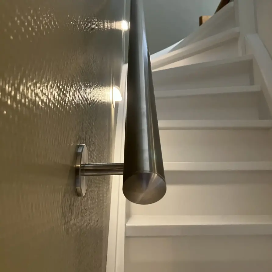RVS trapleuning - rond smal - met trapleuning houders type 3 luxe + bevestigingsmaterialen - op maat - van 30 t/m 595 cm - geborsteld RVS 304. Een smalle ronde RVS trapleuning van geborsteld RVS 304 met een diameter van 33,7 mm. Een klassieke ronde leuning, met de moderne look van roestvrij staal: Een elegante trapleuning van RVS, geschikt voor een breed scala aan interieurstijlen.