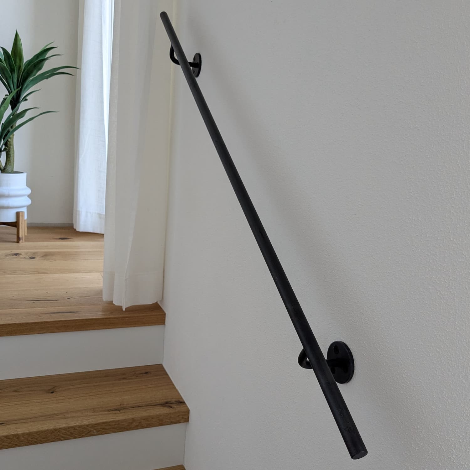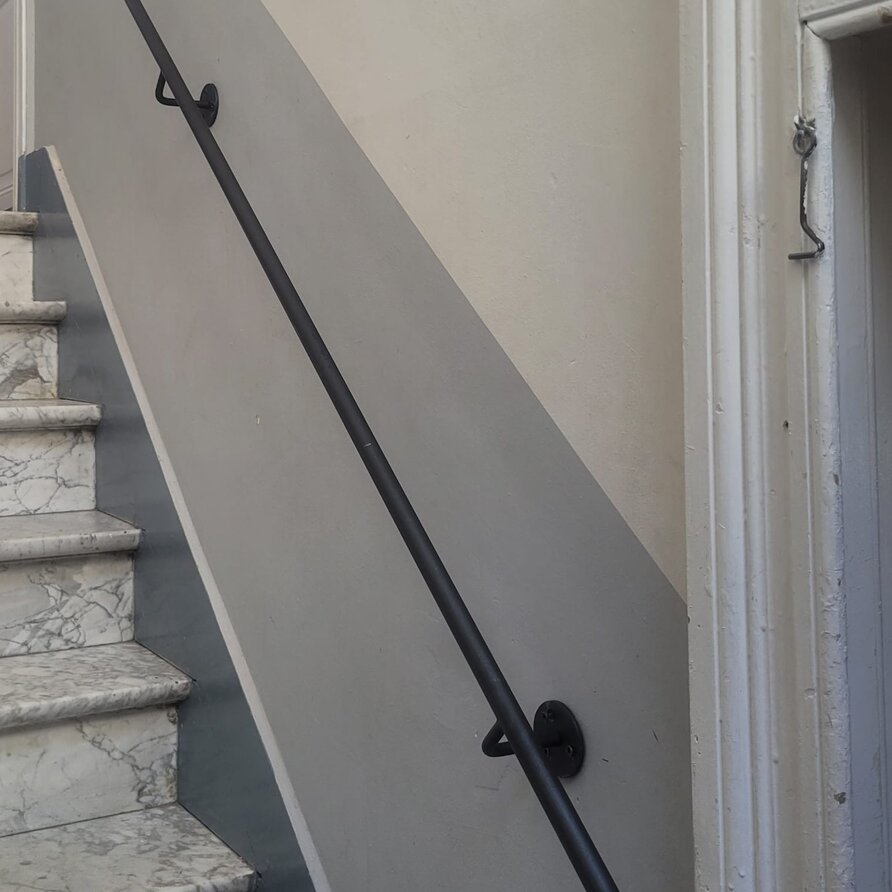 Uw smeedijzer leuning wordt - in eigen werkplaats door ervaren vakmannen - op maat vervaardigd. De trapleuning wordt tot op de mm in de gewenste lengte gezaagd, de houders worden aan de leuning gelast, de uiteinden worden naar wens afgewerkt & uiteindelijk wordt de leuning transparant gecoat. Dit alles doen wij op ambachtelijke wijze, met veel plezier & aandacht voor detail. U ontvangt deze smeedijzer trapleuning met leuningdragers type 1 (gelast), inclusief de juiste bevestigingsmaterialen. De smeedijzeren trapleuninghouder type 1 is een stoere steun met een ronde vormgeving en drie zichtbare bevestigingsschroeven.