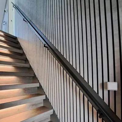 Een toegankelijke rechthoekige trapleuning met moderne type 11 leuningdragers. Deze donkergrijze 40x20 mm leuning is geschikt voor praktisch alle moderne interieurstijlen, wordt op maat vervaardigd en geleverd incl. houders + bevestigingsmaterialen. Lees meer