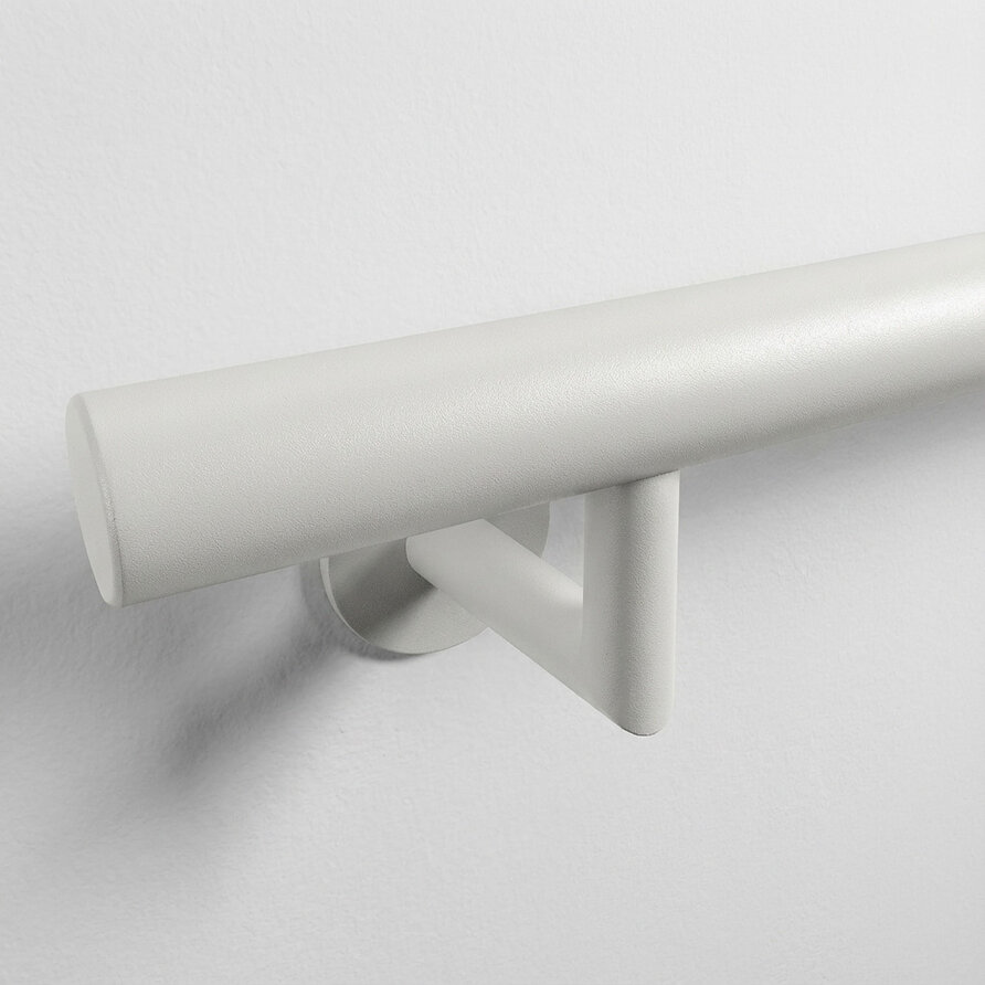 Trapleuning grijs gecoat - rond - met trapleuning houders type 3 luxe + bevestigingsmaterialen - op maat - van 30 t/m 595 cm - grijze fijnstructuur poedercoating - RAL 7030, 7044, 1019 of 9002. Een ronde trapleuning grijs gecoat met een diameter van 42,4 mm. De stalen leuning is voorzien van een grijze fijnstructuur poedercoating, waarbij u kunt kiezen tussen 4 bijzondere grijstinten: RAL 7030 (steengrijs), RAL 7044 (zijdegrijs), RAL 1019 (grijsbeige) en RAL 9002 (grijswit). Een toegankelijke grijze trapleuning, geschikt voor een breed scala aan interieurstijlen. LET OP: Bij deze trapleuning worden de uiteinden standaard dichtgelast en afgewerkt, voor een luxe & strak afgewerkte leuning!