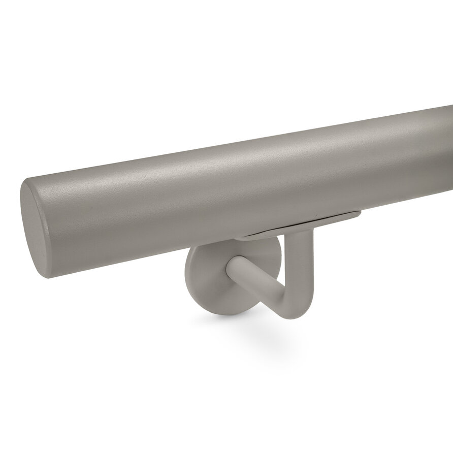 Trapleuning grijs gecoat - rond - met trapleuning houders type 3 + bevestigingsmaterialen - op maat - van 30 t/m 595 cm - grijze fijnstructuur poedercoating - RAL 7030, 7044, 1019 of 9002. Een ronde trapleuning grijs gecoat met een diameter van 42,4 mm. De stalen leuning is voorzien van een grijze fijnstructuur poedercoating, waarbij u kunt kiezen tussen 4 bijzondere grijstinten: RAL 7030 (steengrijs), RAL 7044 (zijdegrijs), RAL 1019 (grijsbeige) en RAL 9002 (grijswit). Een toegankelijke grijze trapleuning, geschikt voor een breed scala aan interieurstijlen. LET OP: Bij deze trapleuningen worden de uiteinden standaard dichtgelast en afgewerkt, voor een luxe & strak afgewerkte leuning!