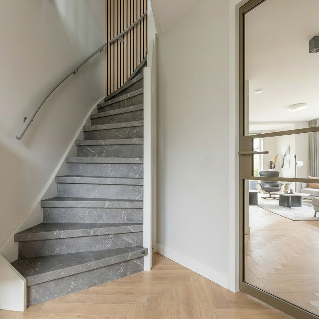 Een toegankelijke ronde trapleuning grijs gecoat met moderne type 3 leuningdragers. Deze sfeervolle grijze leuning is geschikt voor praktisch alle moderne interieurstijlen, wordt op maat vervaardigd en geleverd incl. houders + bevestigingsmaterialen. Lees meer