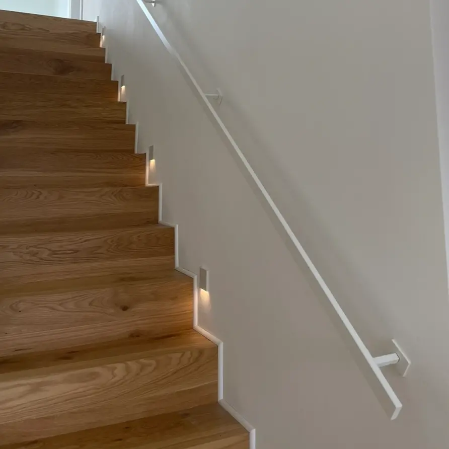Een stijlvolle rechthoekige trapleuning wit gecoat met strakke type 16 leuningdragers. Deze witte 40x15 mm leuning past prachtig in een moderne interieurstijl, wordt op maat vervaardigd en geleverd incl. houders + bevestigingsmaterialen. Lees meer