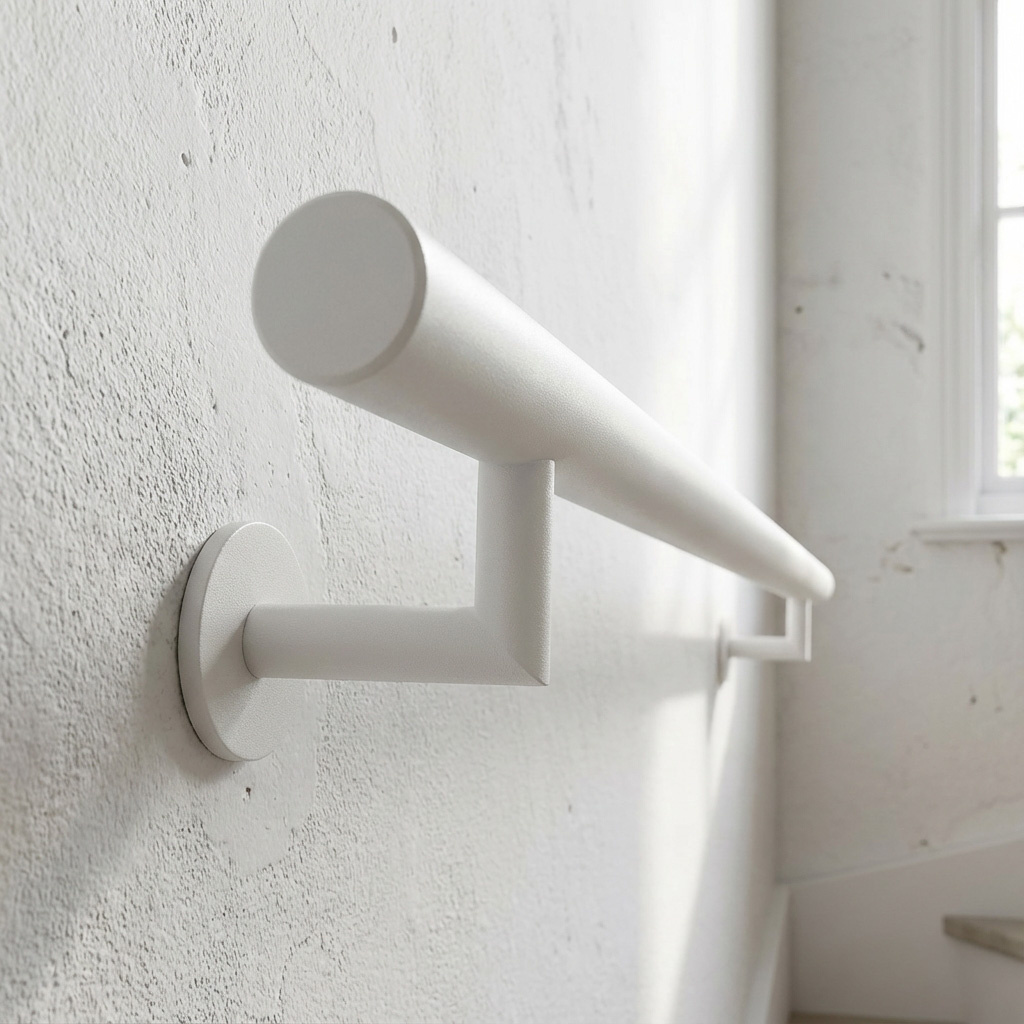 Een elegante ronde trapleuning wit gecoat met trendy type 3 luxe leuningdragers. Deze witte leuning is geschikt voor praktisch alle moderne interieurstijlen, wordt op maat vervaardigd en geleverd incl. houders + bevestigingsmaterialen. Lees meer
