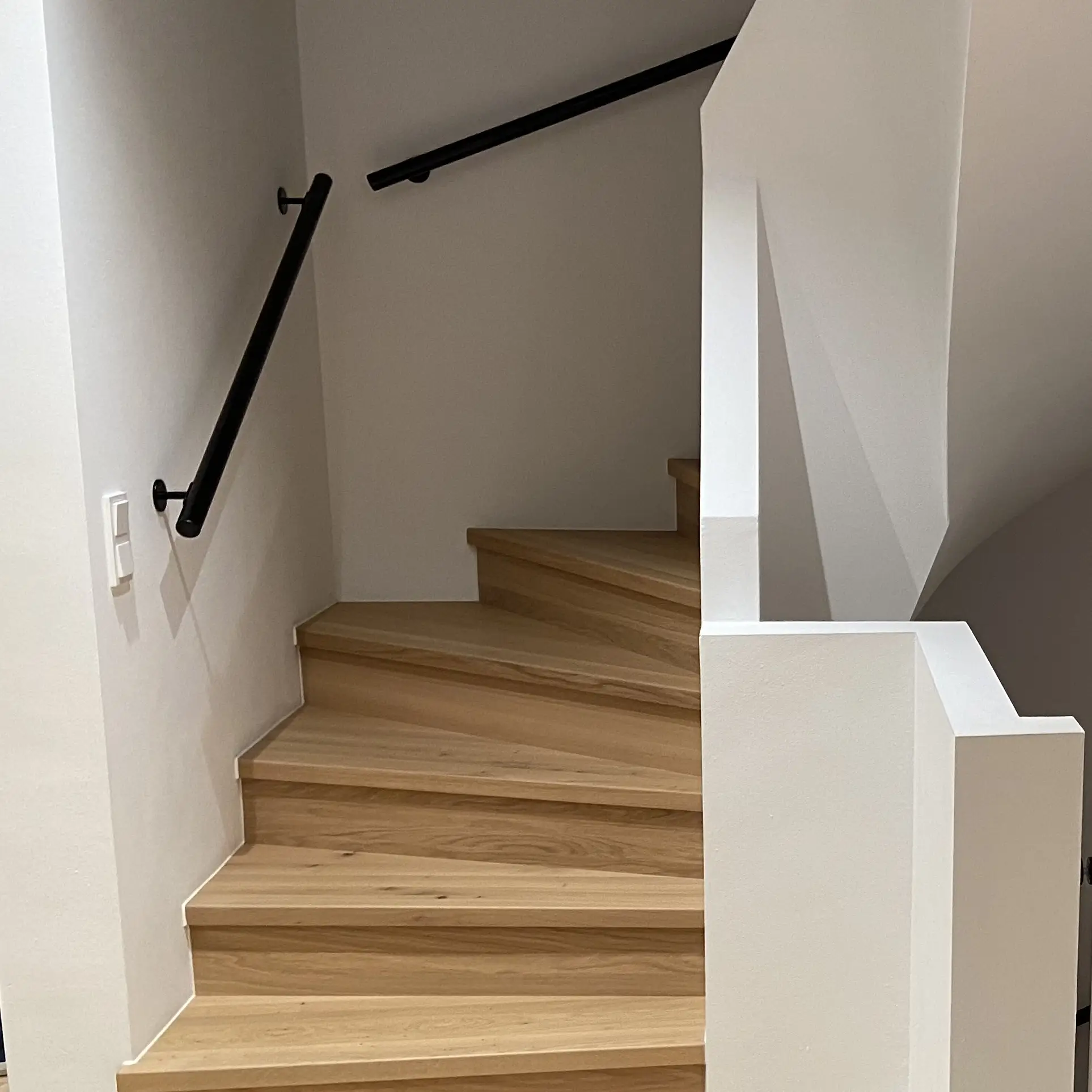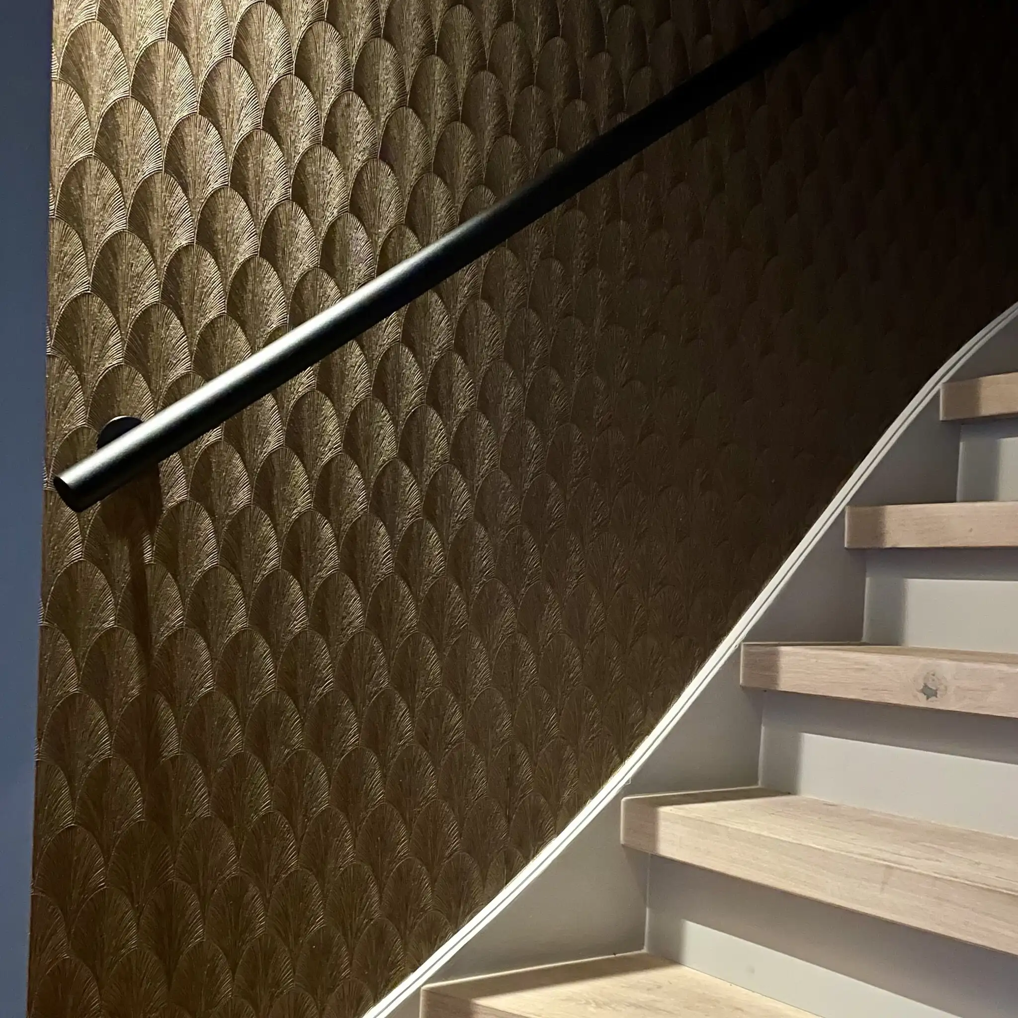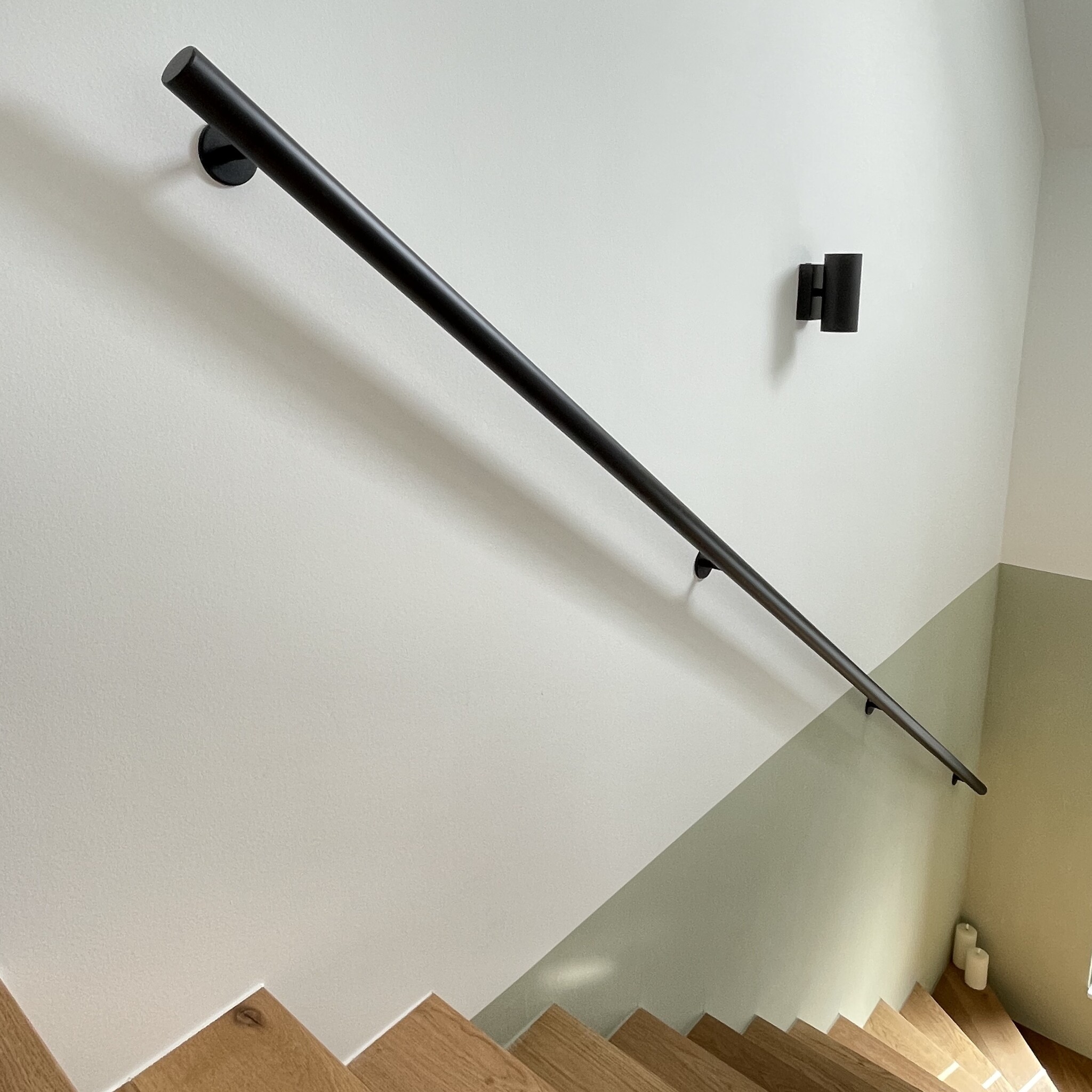 Een toegankelijke ronde trapleuning zwart gecoat met moderne type 5 leuningdragers. Deze zwarte leuning is geschikt voor praktisch alle moderne interieurstijlen, wordt op maat vervaardigd en geleverd incl. houders + bevestigingsmaterialen. Lees meer