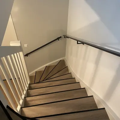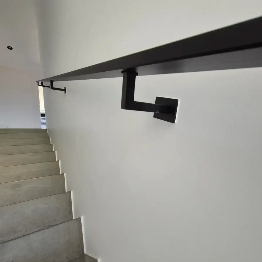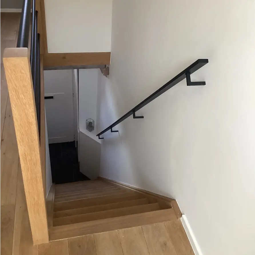 Een stijlvolle rechthoekige trapleuning zwart gecoat met moderne type 11 leuningdragers. Deze zwarte 40x15 mm leuning is ideaal geschikt voor een modern interieur, wordt op maat vervaardigd en geleverd incl. houders + bevestigingsmaterialen. Lees meer