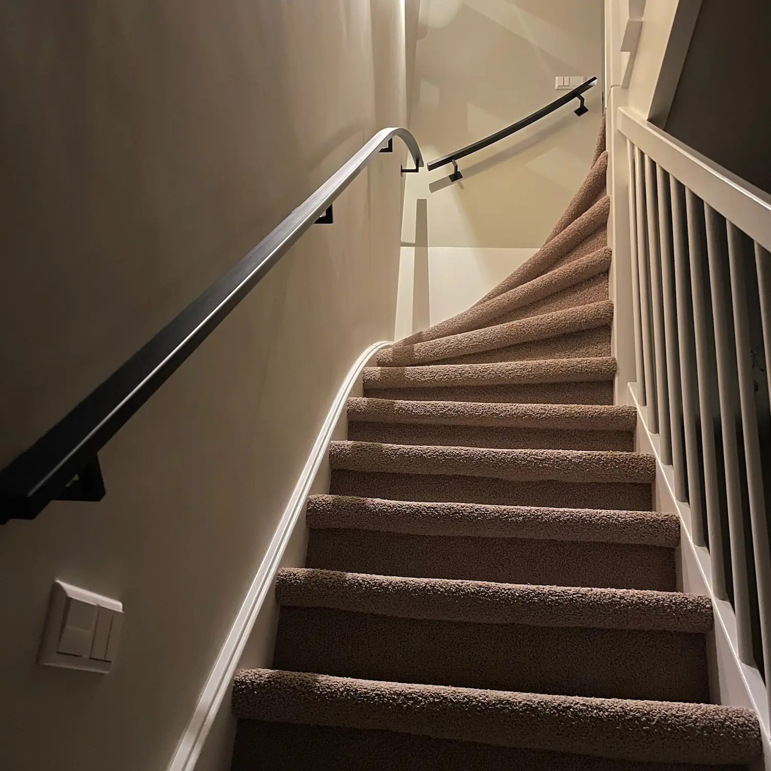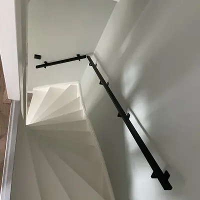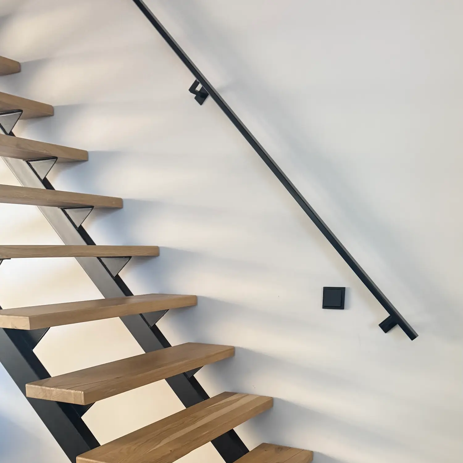 Een toegankelijke rechthoekige trapleuning zwart gecoat met moderne type 11 leuningdragers. Deze zwarte 40x20 mm leuning is geschikt voor praktisch alle moderne interieurstijlen, wordt op maat vervaardigd en geleverd incl. houders + bevestigingsmaterialen Lees meer